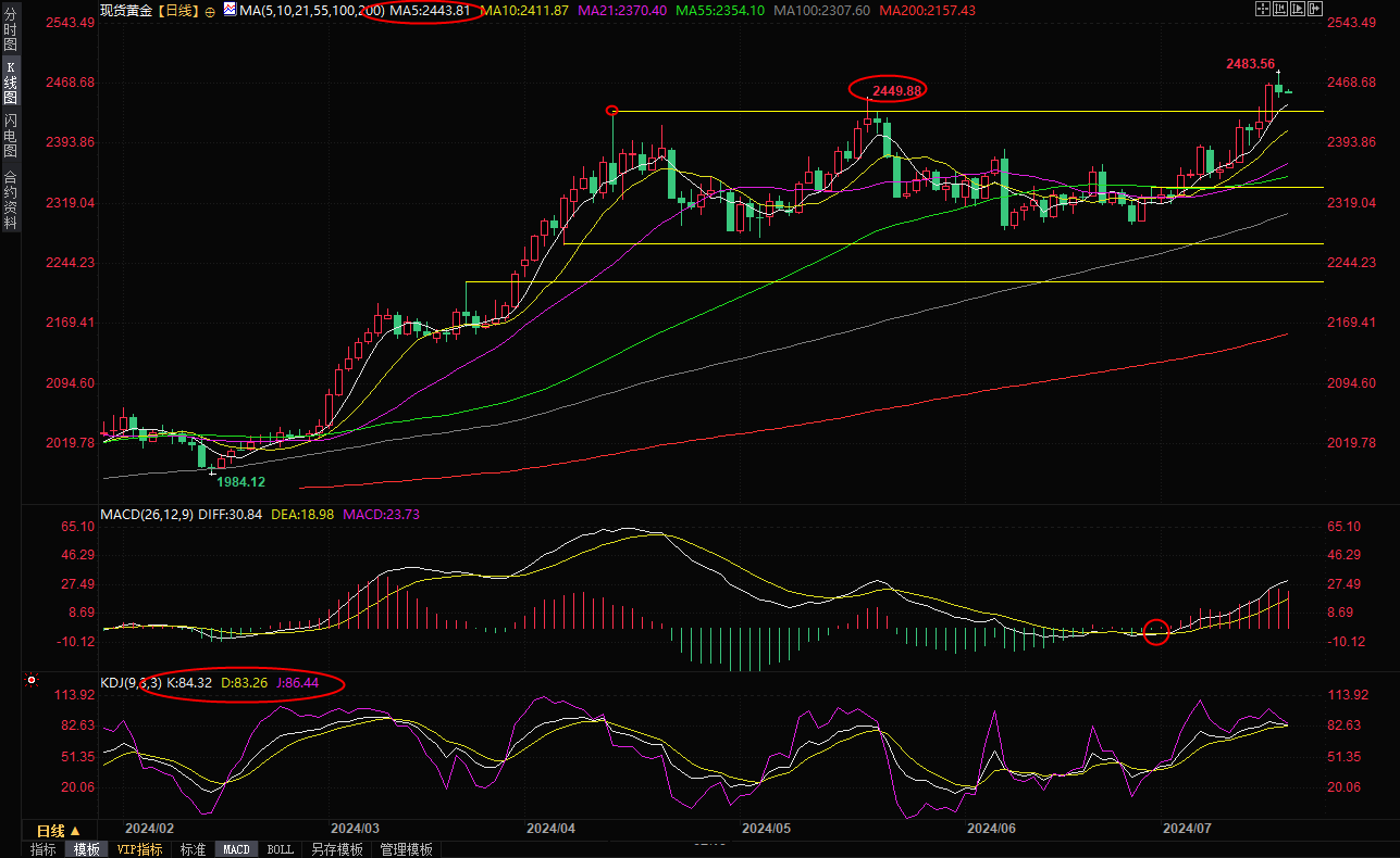 现货黄金窄幅震荡,目前交投于2460.79美元/盎司附近。周三金价冲高回落,早些时候一度刷新历史高点至2483.56美元/盎司附近,不过,尾盘回吐涨幅,收报2458.51美元/盎司附近。基本面来看,并未明显的利空消息,金价的回落较大可能是因为多头的获利了结。