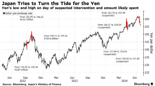 据彭博社估计,日本上周四动用了约 3.5 万亿日元来支持汇率,第二天又动用了 2.1 万亿日元。在此之前,日本曾在 4 月底和 5 月初大规模干预汇率。