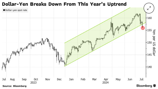 周四(7月18日),美元对日元汇率自六月以来一度突跌破156 关口至155.37,自上周日本疑似干预汇率推动日元升值以来,日元已上涨约 4%。