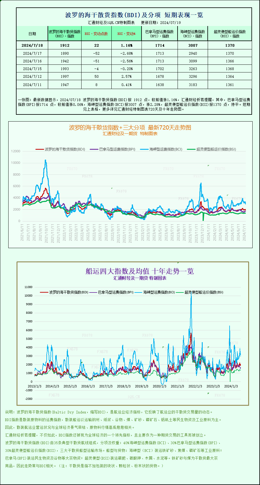 汇通财经APP讯——最新数据显示,2024/07/18波罗的海干散货指数(BDI)报1912点,较前值涨1.16%,其中,巴拿马型运费指数(BPI)报1714点,较前值涨0.06%,海岬型运费指数(BCI)报3007点,涨2.28%,超灵便型船运价指数(BSI)报1370点,持平。波罗的海干散货指数+三大分项的最新720天走势图、十年走势图等详见汇通财经特制图表。