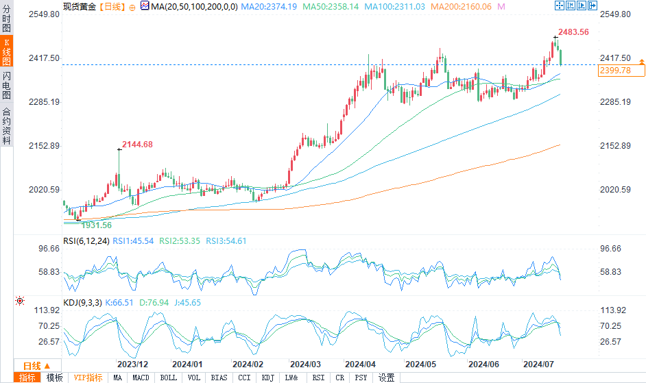 现货黄金价格最后下跌50.60美元,至每盎司2406.30美元。