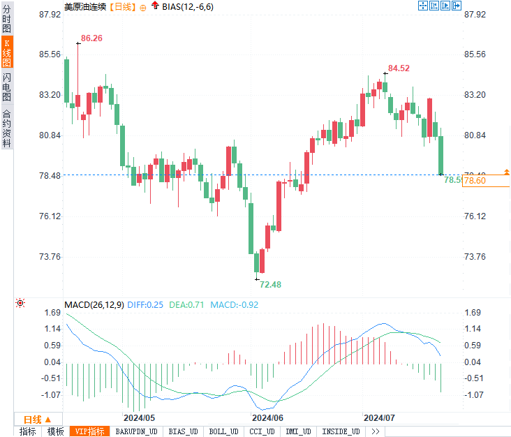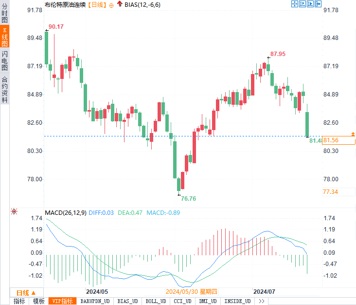 WTI 8月原油期货收跌2.69美元/桶,跌幅约3.25%,收报80.13美元/桶。截至发稿,现报78.61美元/桶,跌幅3.31%。