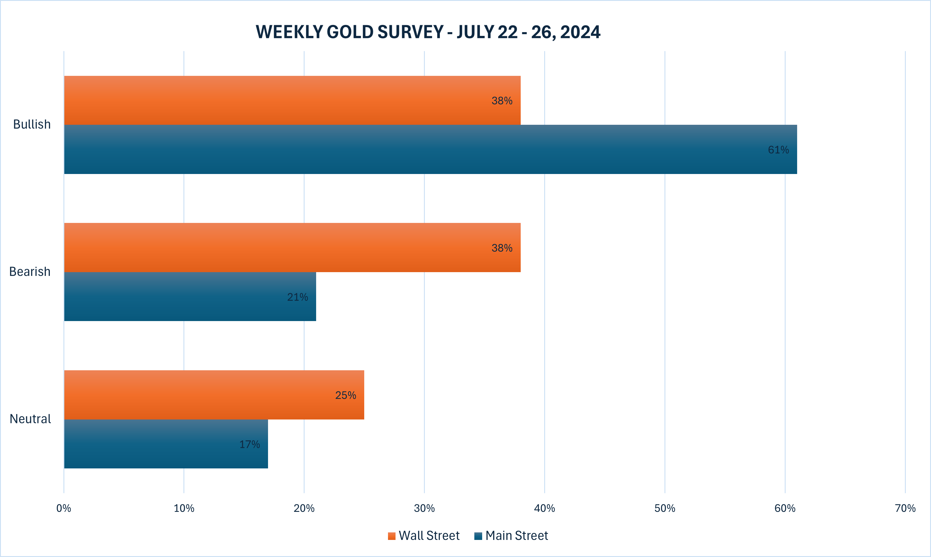 根据最新黄金调查,华尔街分析师和散户投资者对黄金价格的未来走势普遍持乐观态度。在参与调查的13位华尔街分析师中,有12位(占92%)预计下周金价将继续上涨,仅有1位分析师(占8%)预测金价将下跌。在178名参与在线调查的散户投资者中,67%的人看涨,18%看跌,剩余15%预计金价将横盘整理。