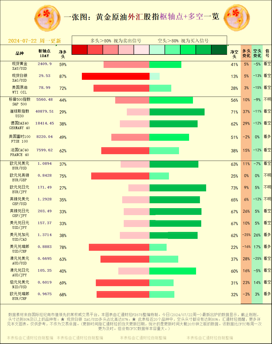 标题:一张图:2024/07/22黄金原油外汇股指"枢纽点+多空占比"一览