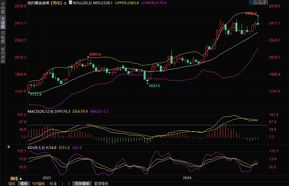 8 月份黄金期货上周五收报 2402.80 美元,当日下跌 1.84%,较前一周下跌 0.5%。
