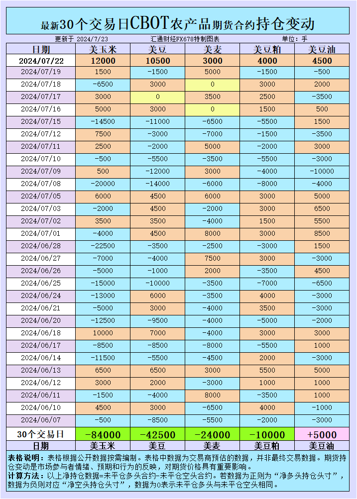 增加CBOT玉米投机性净空头;增加CBOT大豆投机性净空头;增加CBOT小麦投机性净空头;增加CBOT豆粕投机性净空头;增加CBOT豆油投机性净多头。