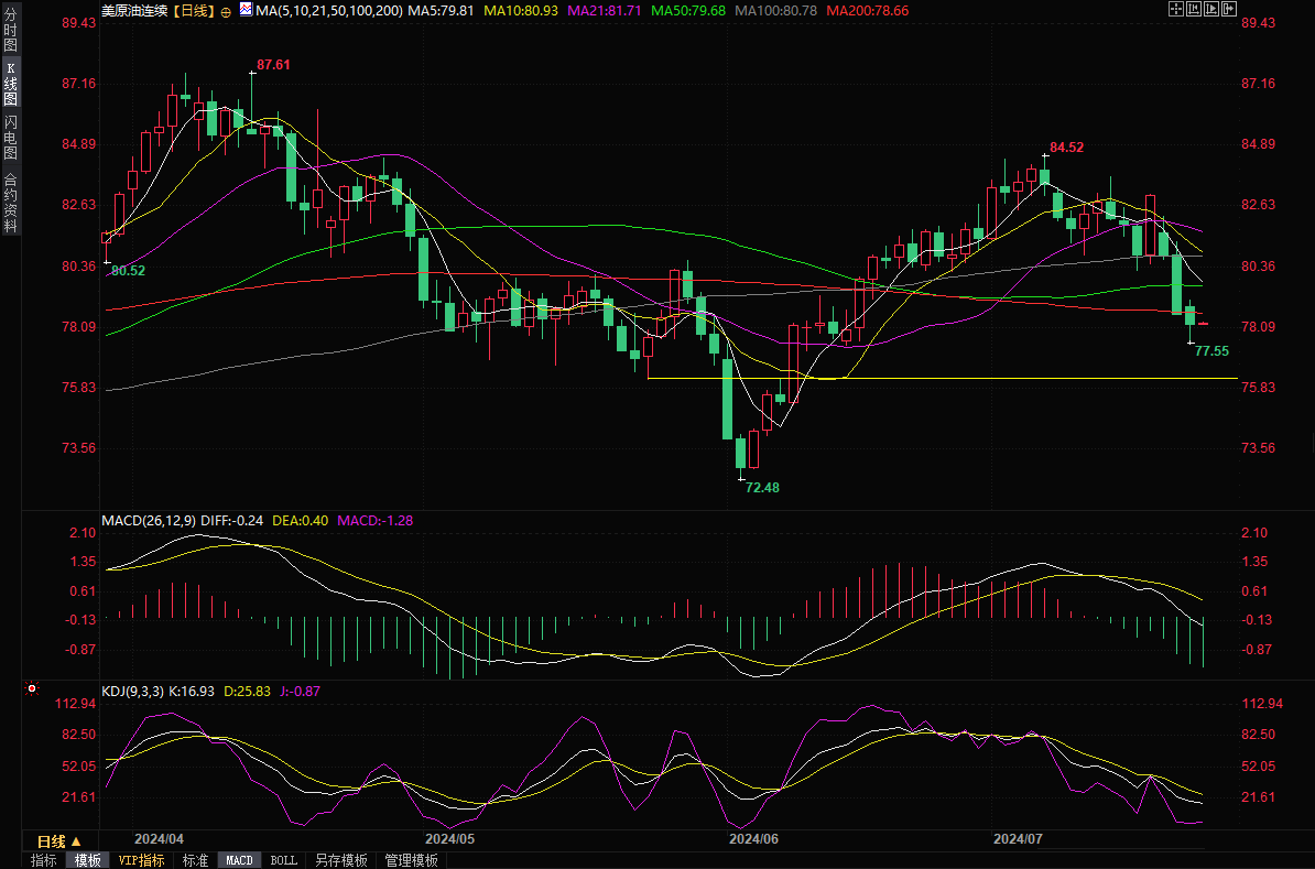美原油目前交投于78.26美元/桶附近,油价周一连续第二个交易日下跌,并触及逾一个月以来的最低水平,投资者淡然看待美国总统拜登决定结束连任竞选,而将注意力集中在库存增加和需求疲软的迹象上。