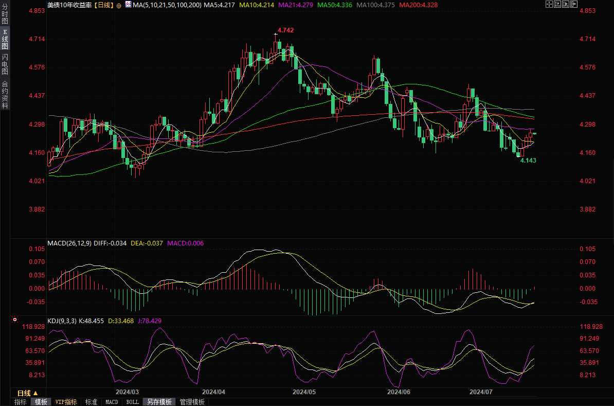 美国10年期公债收益率 周一上涨2.1个基点,至4.26%,日线录得三连阳。