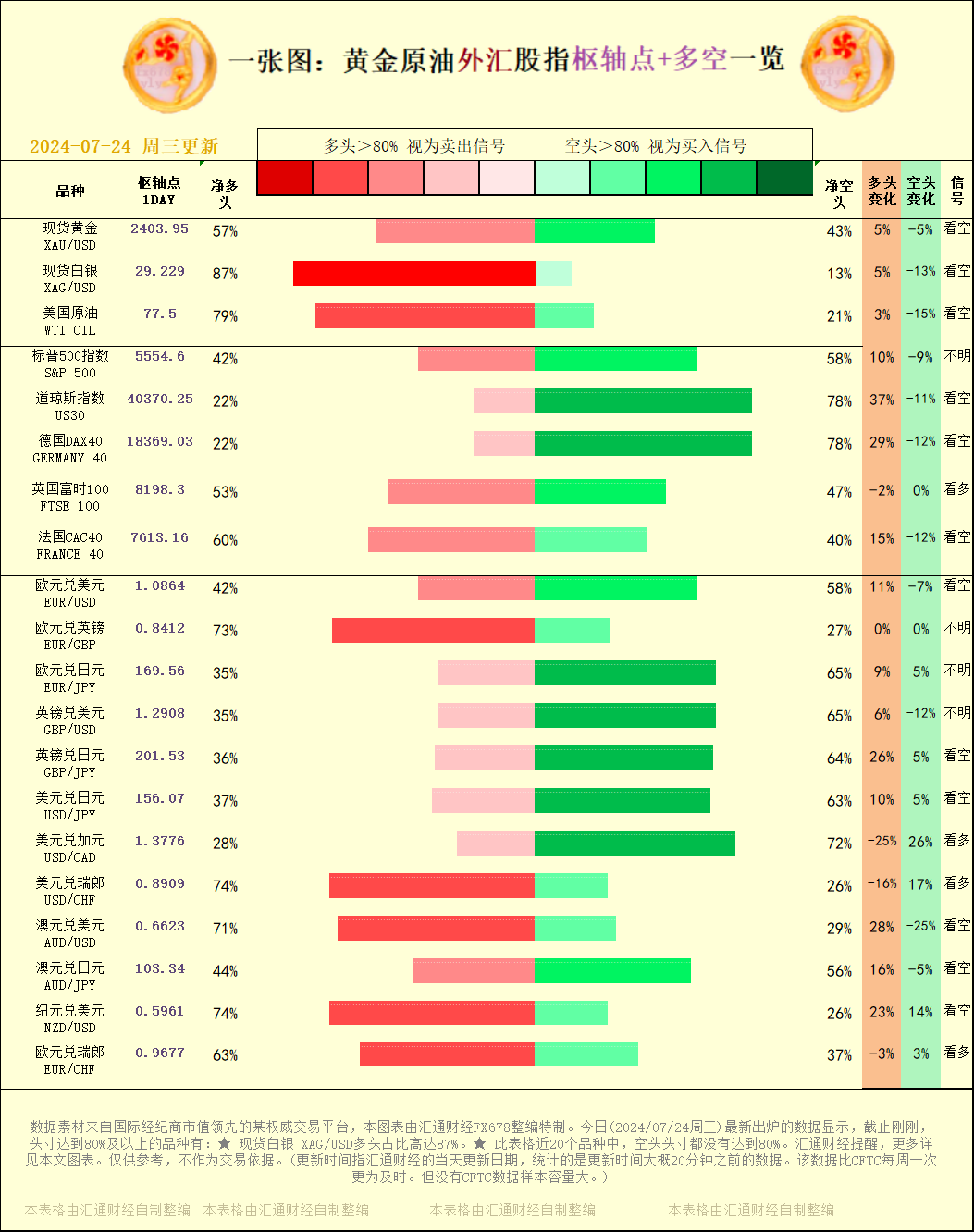 一张图:2024/07/24黄金原油外汇股指"枢纽点+多空占比"一览