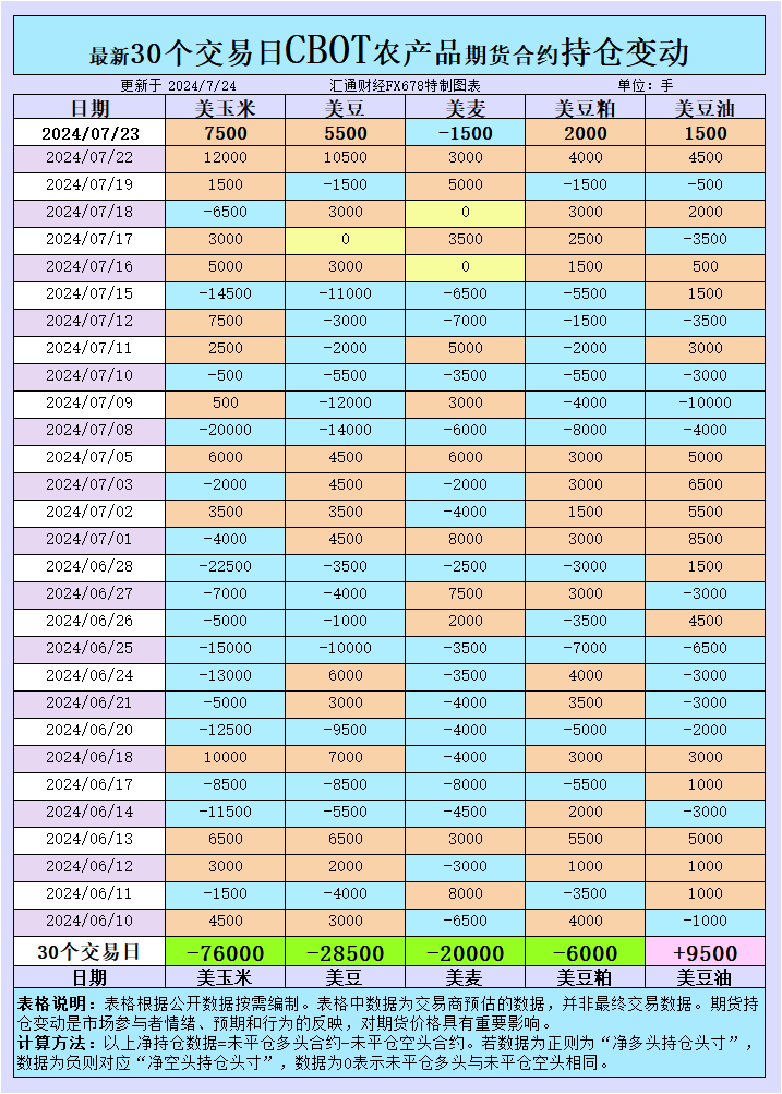 持仓变动显示持续乐观在豆油市场上,大宗商品基金无论是在7月23日还是在过去的30个交易日中,均增加了CBOT豆油的投机性净多头,显示出市场对豆油价格的持续乐观态度。