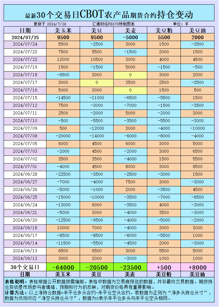 汇通财经APP讯——周五(7月26日),国际农产品市场经历了一系列动态变化。CBOT持仓变动揭示了市场对大豆、豆粕和豆油的乐观情绪,而小麦市场则显示出供应充足的迹象。玉米期货受到天气担忧的提振。本文深入分析了这些变化背后的基本面和技术面因素,为专业交易者提供了市场趋势的洞察。