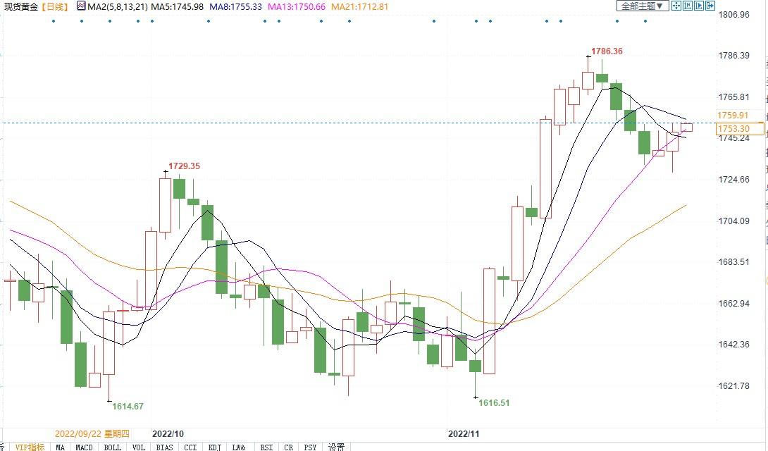 金价较11月3日的两年低点上涨了近8%,目前交投于1750美元附近。