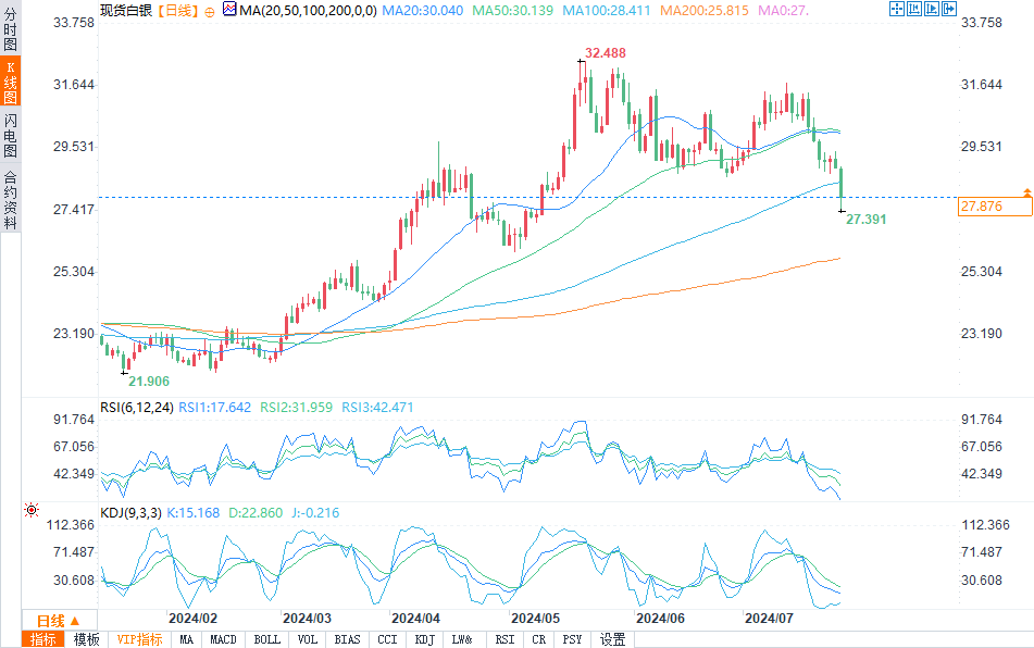 现货白银报27.82美元/盎司,跌幅3.66%。