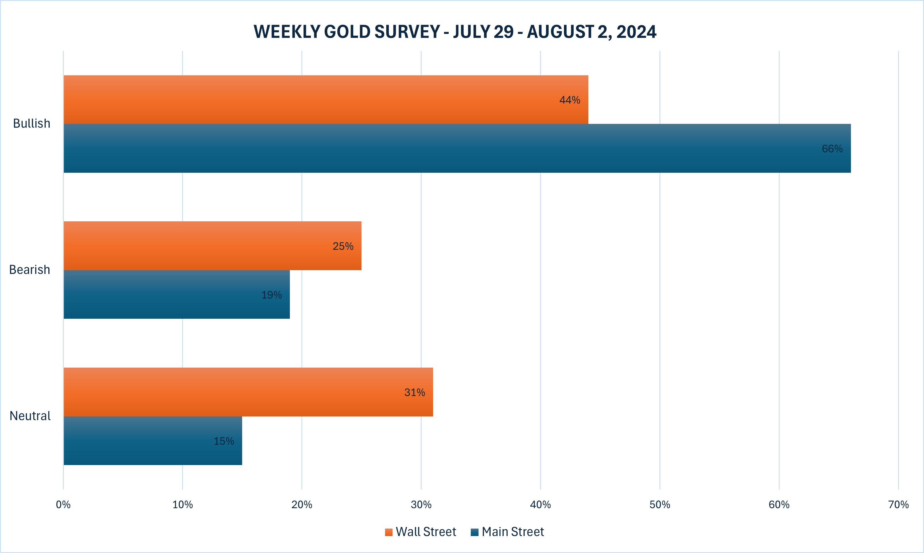 在本周的Kitco News黄金调查中,共有16位分析师参与,其中7位(占比44%)预计下周金价将上涨,而只有4位(占比25%)预测价格将下跌。其余5位分析师(占比31%)认为金价将在下周横向整理。同时,在Kitco的在线调查中,共有193位散户投资者参与投票,其中127位(占比66%)看多,37位(占比19%)看空,29位(占比15%)预计金价将在一定范围内波动。