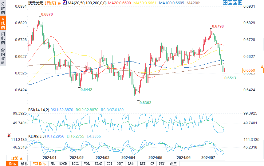 北京时间周五(7月26日)17:50,澳元/美元报0.6558/59,涨幅0.32%。英镑/美元报1.2868/69,涨幅0.14%。美元/日元报154.152/165,涨幅0.15%。