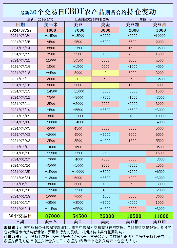 7月29日,市场数据显示投资者在CBOT大豆期货上积极调整持仓,净空头头寸有所增加。这一变化可能反映了市场对大豆价格短期内可能面临的下行风险的预期,以及对当前市场基本面因素的重新评估。