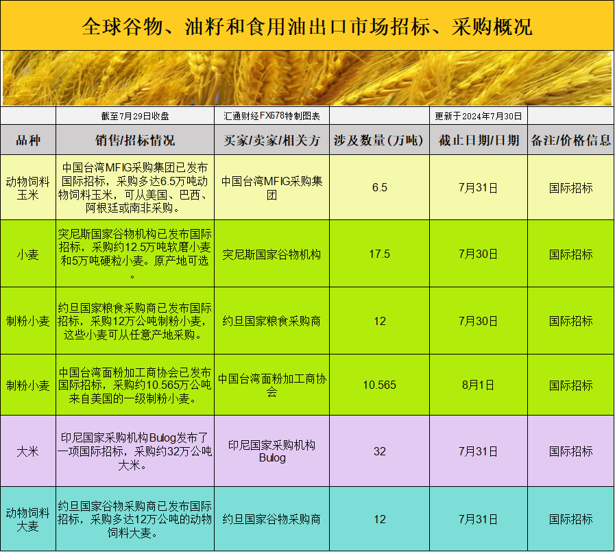 知名机构的报告显示,全球多地采购机构已经发布了多项国际招标,涉及玉米、小麦和大米等产品。这些招标的截止日期大多集中在7月底和8月初,显示了国际市场对农产品的迫切需求。