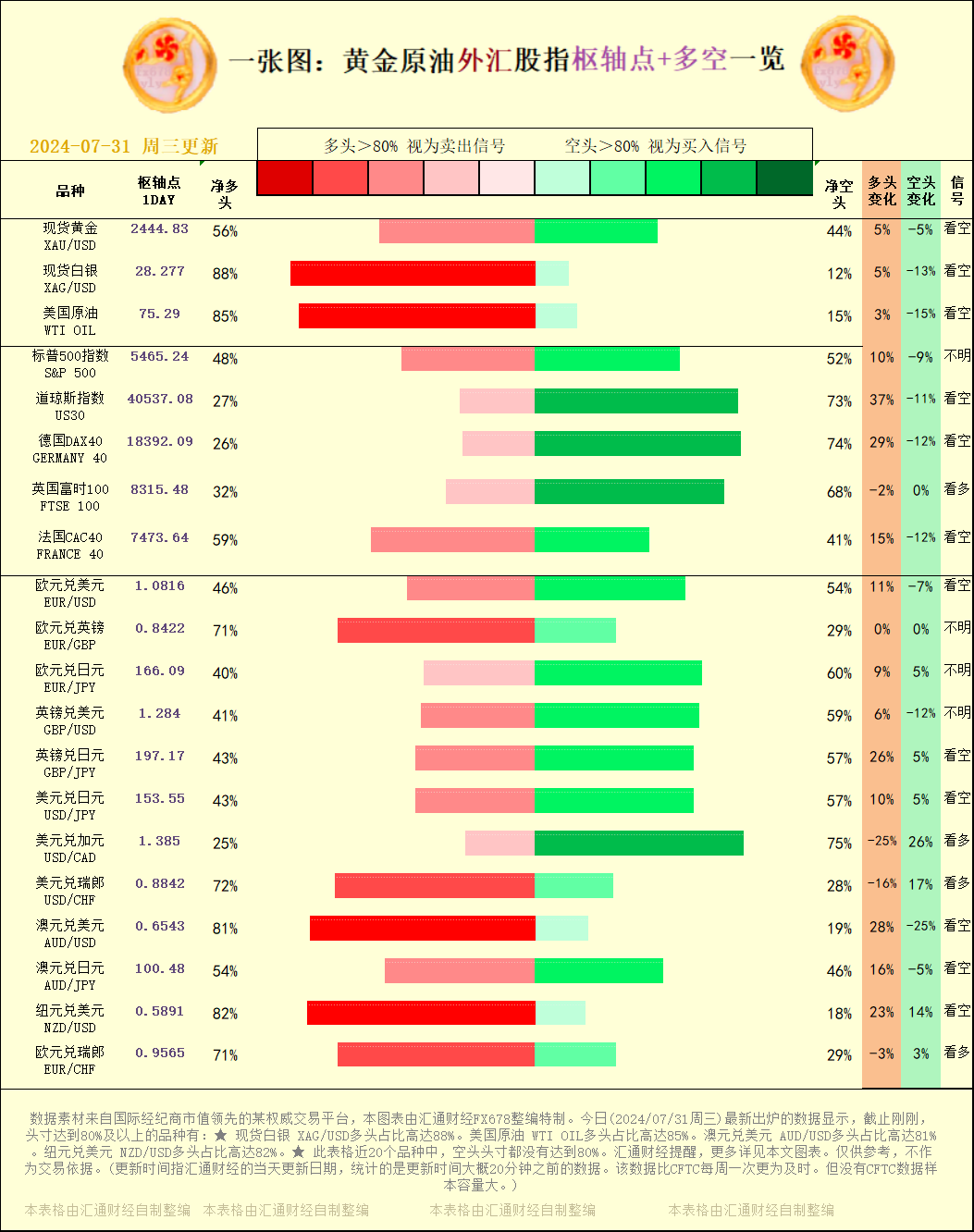 标题:一张图:2024/07/31黄金原油外汇股指"枢纽点+多空占比"一览