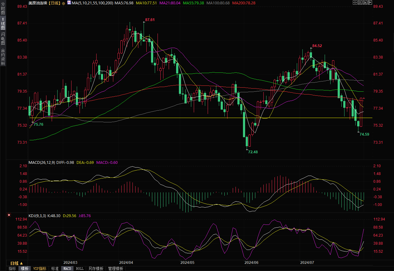 美原油目前交投于78.59美元/桶附近。油价周三强势反弹近 5%,远离周二触及的近两个月低位,哈马斯领导人在伊朗遇刺身亡后,投资者担心中东冲突可能扩大,而且美国原油库存大幅下降,美联储向市场传递9月份降息信号,