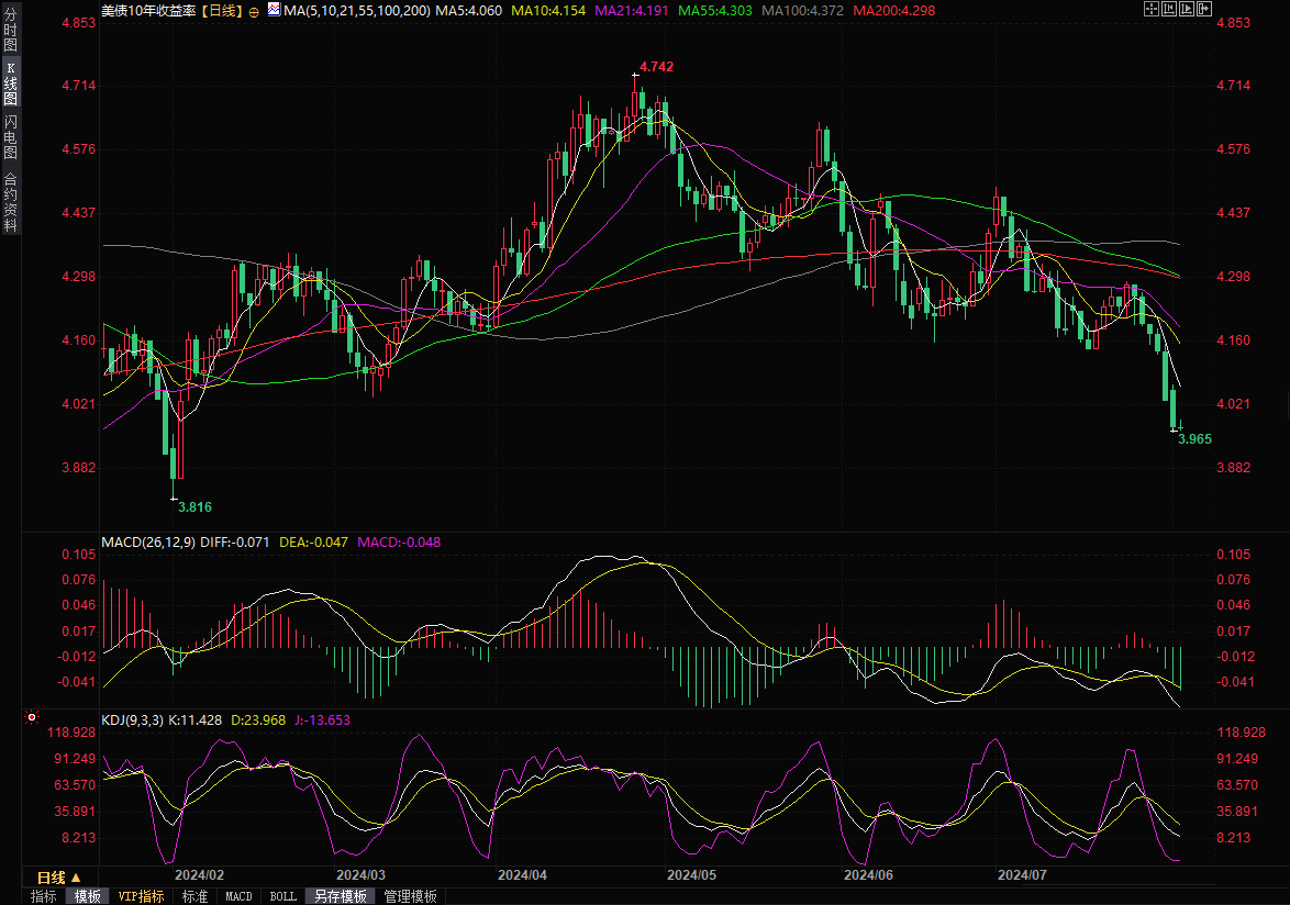 美国国债收益率周四下跌,因疲软的经济数据和美联储主席鲍威尔在上一交易日发表的鸽派言论巩固了市场对美联储最终将在下月降息的预期,这是四年多来的首次降息。