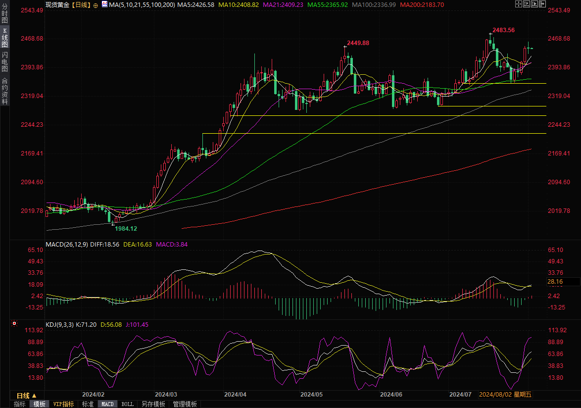 现货黄金窄幅震荡,目前交投于2445美元/盎司附近。金价周四在美元汇率持续反弹后回落,收报2446.20美元/盎司,盘中早些时候曾因9月降息预期和避险需求触及两周高点2462.17美元/盎司,目前市场焦点转向本周五将公布的美国非农就业数据。