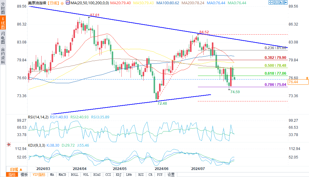 由于对美国经济的担忧,WTI原油期货在前一个交易日大幅下跌后,周五开始回升。尽管近期波动较大,但市场仍维持区间震荡,支撑位在200日移动均线75.77美元,阻力位在50日移动均线77.96美元。