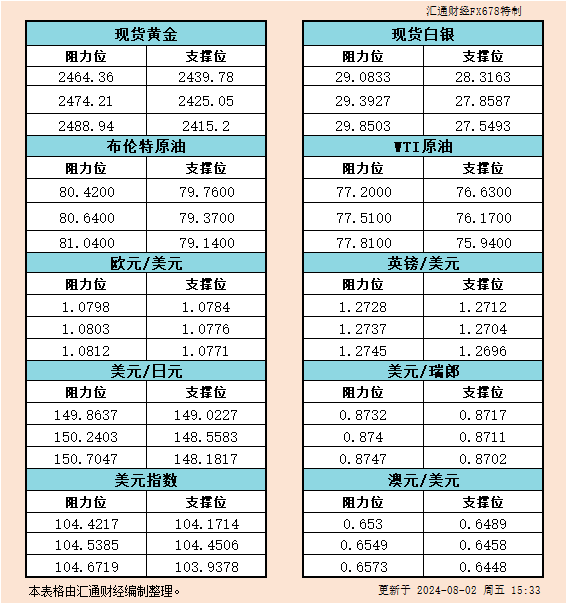 标题:8月2日欧市支撑阻力:金银原油+美元指数等六大货币对