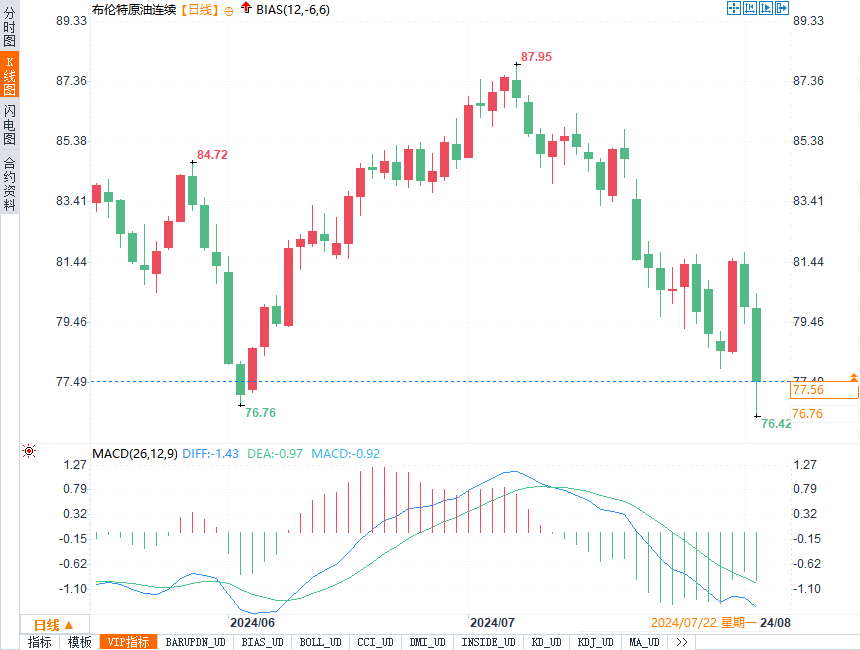 布伦特原油期货结算价下跌2.71美元/桶,收报76.81美元/桶,跌幅3.41%。两大基准原油期货价格盘中低点均下跌逾3美元/桶。