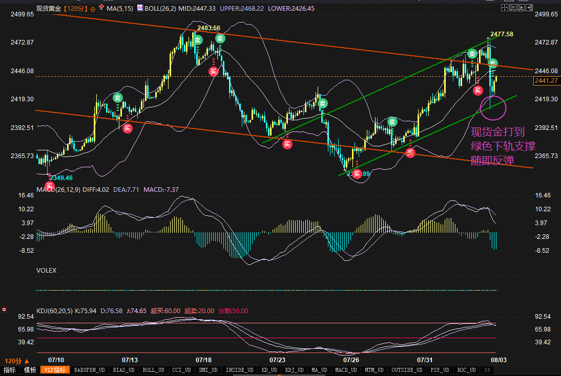 现货黄金非农后的暴跌,是直接从如图绿色通道的上轨直接暴跌到通道下轨支撑位2410一线,然后反弹。