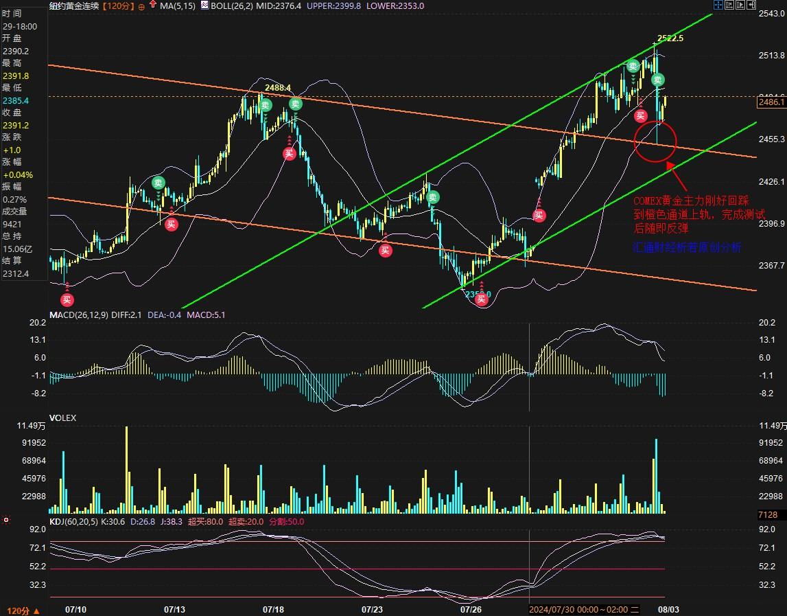 COMEX黄金期货主力的行情,如下图,COMEX金价也是50分钟暴跌了超过60美元,但价格却没有打到绿色通道下轨,而是回踩了我们上文所提8月2日提示的“蓝色支撑线”(对应本文下图中的“黄色支撑线”)。且价格在触碰回踩后随即反弹。