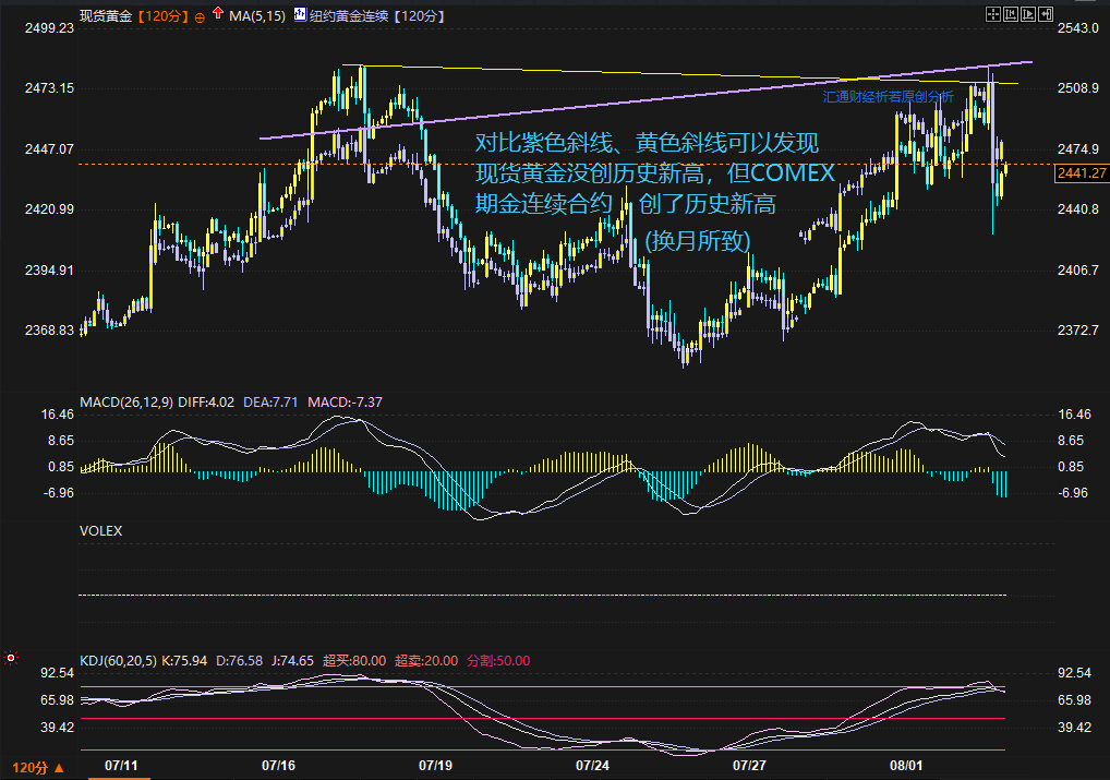 现货黄金在8月2日与7月17日的历史新高相比,没有刷新历史新高,但COMEX黄金连续合约却出现了刷新历史最高点的情况。