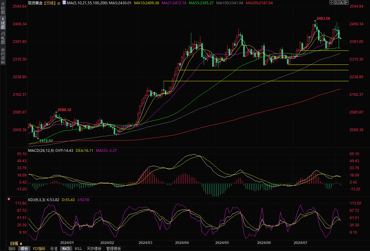 现货黄金窄幅震荡,目前交投于2405.84美元/盎司附近。隔夜金价周一下跌超过1%,盘中最低曾触及2364.21美元/盎司,正好是55日均线支撑所在,受累于经济担忧加剧导致全球更广泛市场遭抛售,不过分析师表示,这对避险黄金而言只是暂时的修正,仍有逢低买盘支撑金价,金价尾盘回升至2400关口上方,收报2409.91美元/盎司。