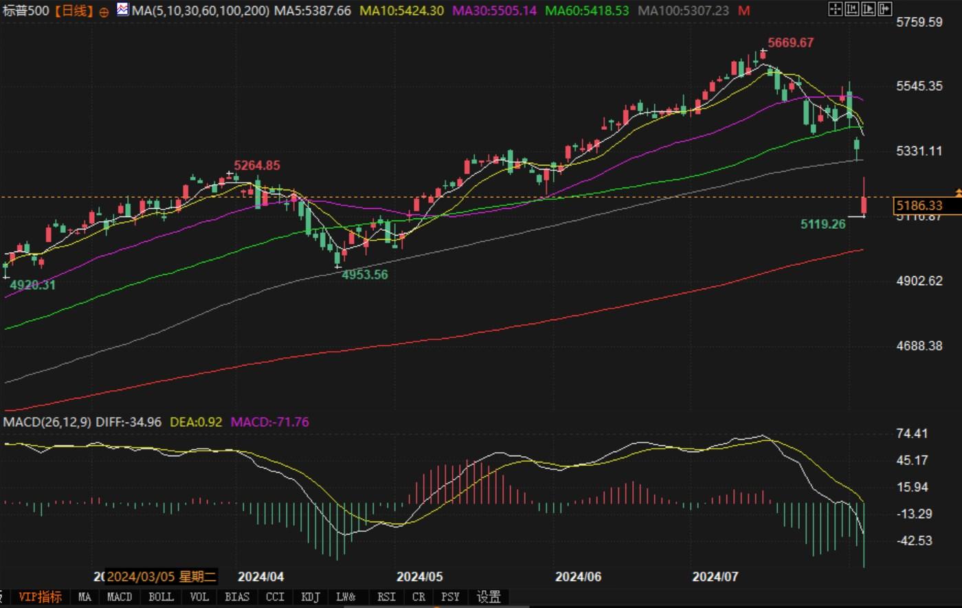 标普500指数8月5日(周一)收盘下跌160.23点,跌幅3.00%,报5186.33点; 纳斯达克综合指数8月5日(周一)收盘下跌570.68点,跌幅3.43%,报16200.08点。