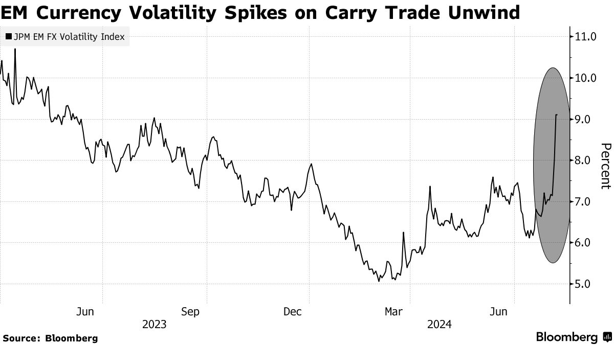 随后,投资者纷纷平仓日元空头头寸,这震动了新兴市场和发达市场,而这些市场曾经是投资者部署这一策略以获得更高回报的目的地。