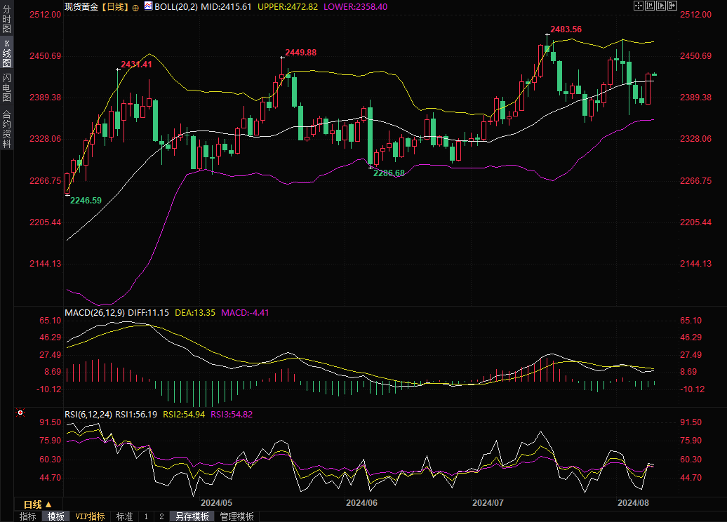 现货黄金窄幅震荡,目前交投于2424.91美元/盎司附近。金价周四上涨超过1%,收报2427.08美元/盎司,结束此前连续五个交易日的跌势,受助于强劲的避险需求和对美联储9月将大幅降息的预期不断增强。