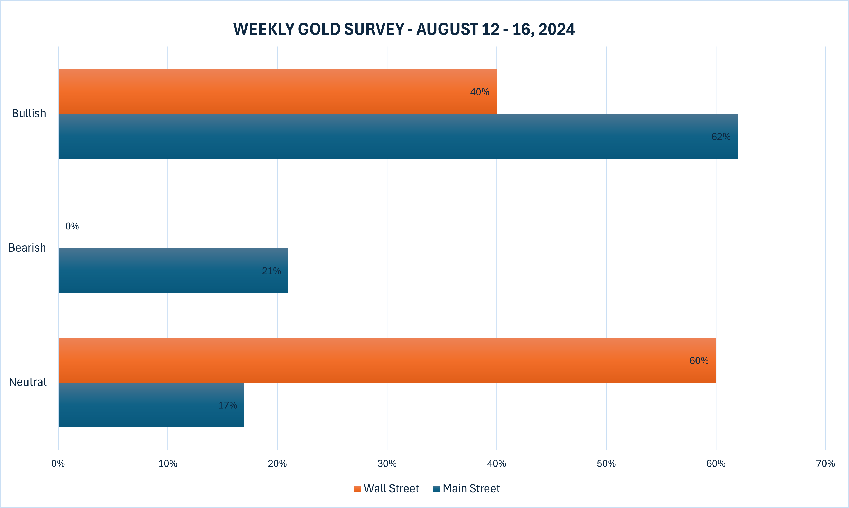 在Kitco News每周黄金调查中,10位市场分析师参与了投票,其中60%的专家预计下周黄金价格将呈现横向整理态势,而40%的人认为黄金将实现进一步上涨,无人预计黄金价格会下跌。同时,210名散户投资者参与了在线调查,62%的散户看多黄金,21%看空,剩余17%的人预计黄金价格将横向整理。