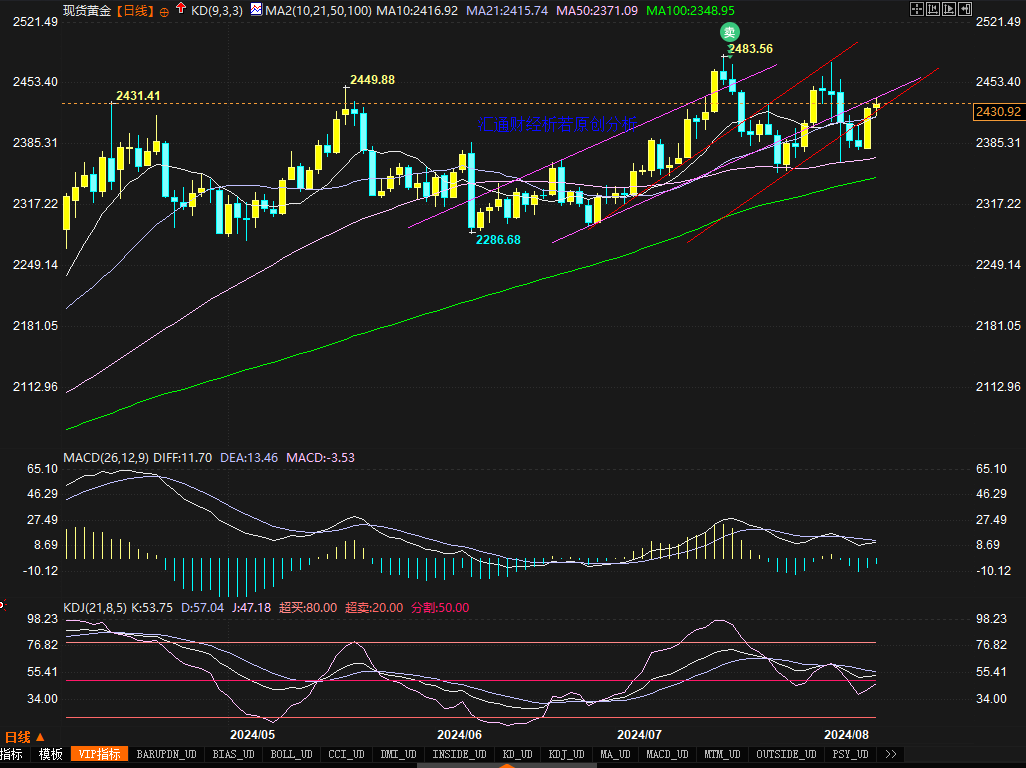 按照本人汇通财经析若的分析逻辑,金价可能会继续朝上试探,而空头也会乘机陆续入场,多空大决战的点位可能在2458附近,一旦被证明这里是本轮涨势的顶部,将可能促使金价再次出现暴跌行情,而近期被反复测试的50日均线会面临再次会测试甚至刺穿的风险。若有刺破,则可关注下方不远处的100日均线的支撑,此均线在最近半年从未被测试过,而在2023年11月中旬和2024年2月中旬分别被测试过两次,均是“蜻蜓点水式”(触碰即反弹)地充当了有效支撑。因此,如果有暴跌且打穿了50日均线并触碰到100日均线,或是多头一个很好的买入机会。当然,这只是通常情况的推测。投资者下单之前需自己根据届时的实际行情做出判断。