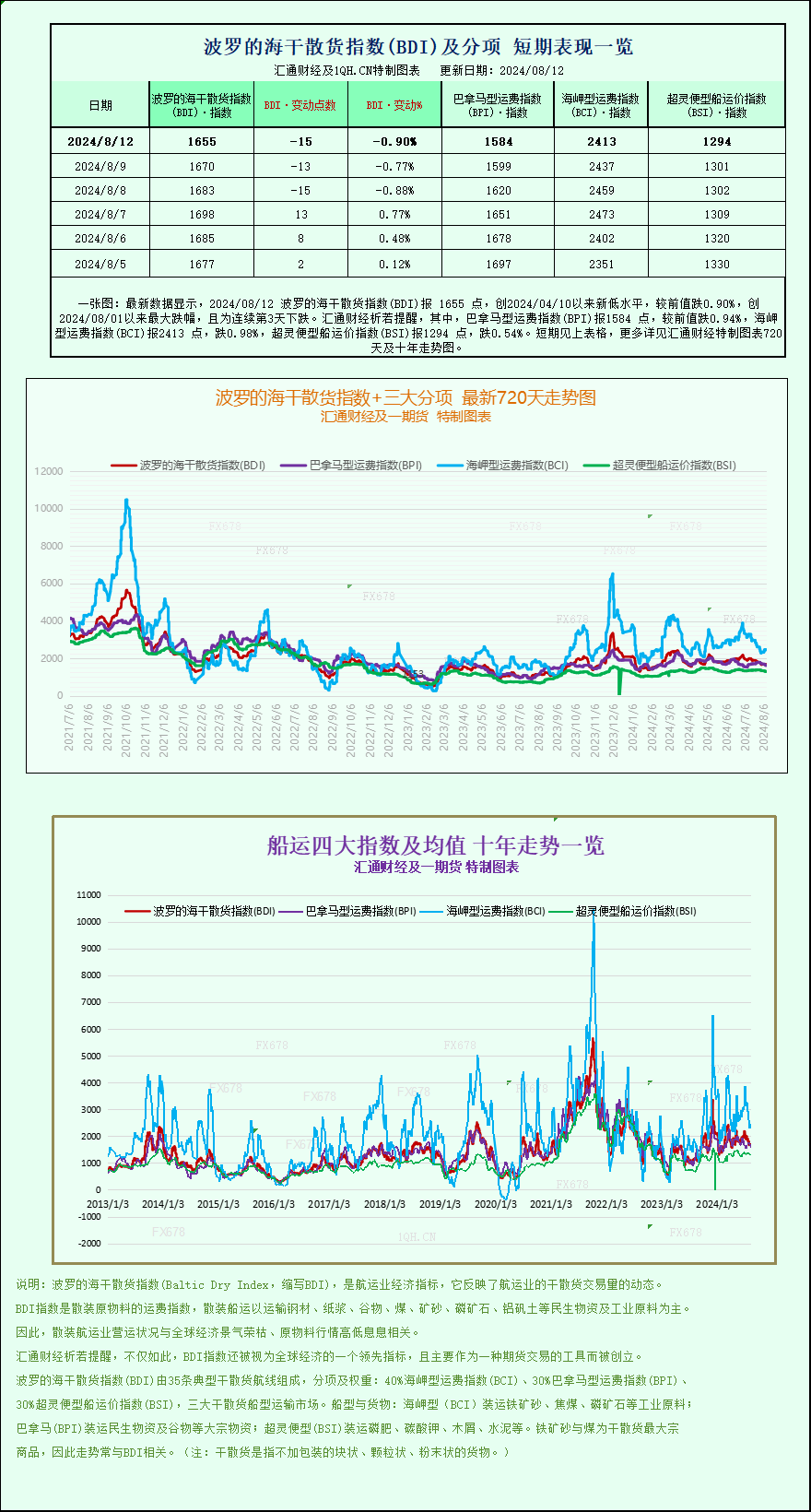 汇通财经APP讯——最新数据显示,2024/08/12波罗的海干散货指数(BDI)报1655点,创2024/04/10以来新低水平,较前值跌0.90%,创2024/08/01以来最大跌幅,且为连续第3天下跌。其中,巴拿马型运费指数(BPI)报1584点,较前值跌0.94%,海岬型运费指数(BCI)报2413点,跌0.98%,超灵便型船运价指数(BSI)报1294点,跌0.54%。波罗的海干散货指数+三大分项的最新720天走势图、十年走势图等详见汇通财经特制图表。