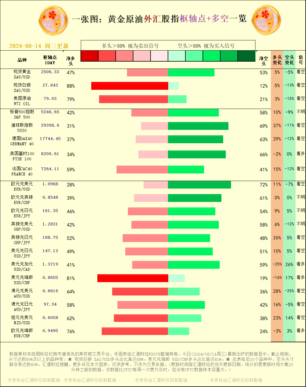 标题:一张图:2024/08/14黄金原油外汇股指"枢纽点+多空占比"一览