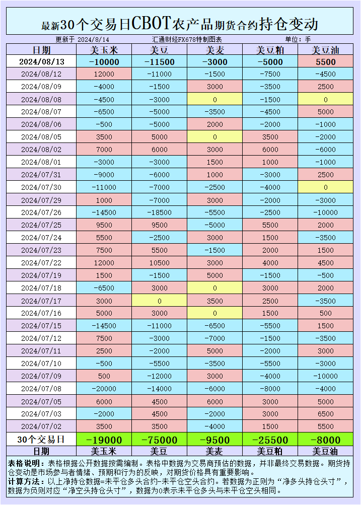 增加CBOT玉米投机性净空头;增加CBOT大豆投机性净空头;增加CBOT小麦投机性净空头;增加CBOT豆粕投机性净空头;增加CBOT豆油投机性净多头。