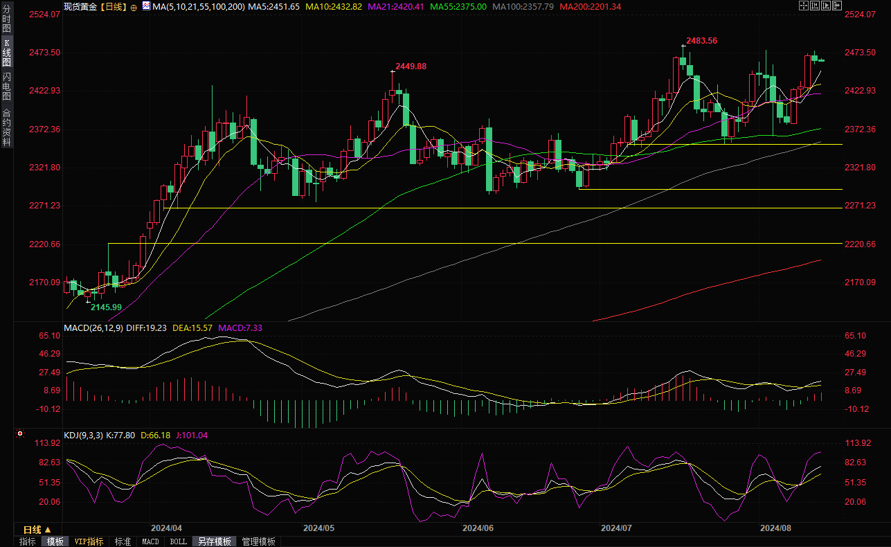 现货黄金窄幅震荡,目前交投于2463.748美元/盎司附近。金价周二持稳,尽管出现了一些获利回吐,但仍徘徊在7月份创下的历史高点附近,收报2464.67美元/盎司,因美国生产者价格数据巩固了美联储9月份降息的希望,美元和国债收益率走低;对地缘局势的担忧情绪也给金价提供支撑。