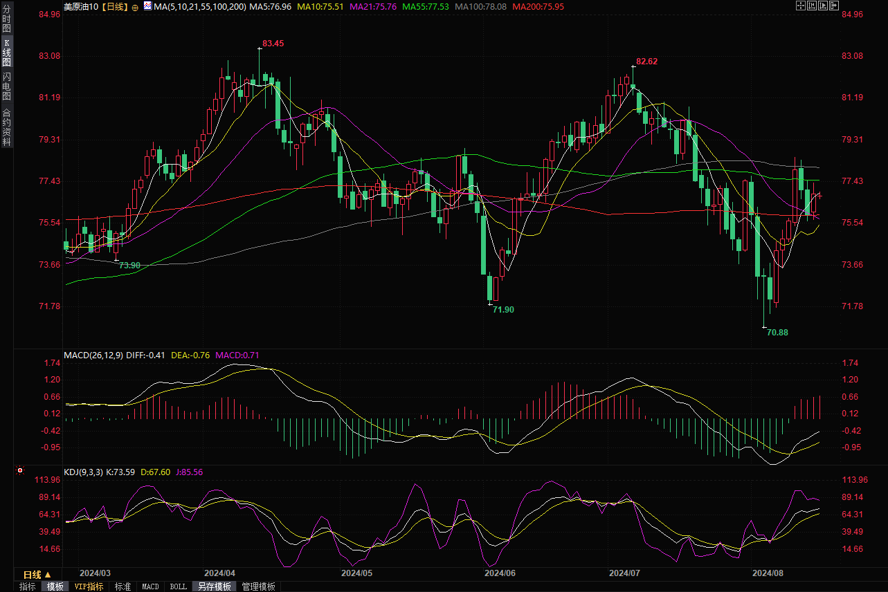美原油10月合约目前交投于76.81美元/桶附近。油价周四上涨逾1美元,因美国经济数据缓解了对全球最大经济体陷入衰退的担忧,不过全球需求放缓担忧限制了涨幅。