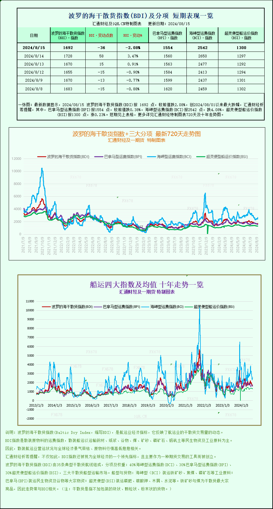 汇通财经APP讯——最新数据显示,2024/08/15 波罗的海干散货指数(BDI)报 1692 点,较前值跌2.08%,创2024/08/01以来最大跌幅,其中,巴拿马型运费指数(BPI)报1554 点,较前值跌0.38%,海岬型运费指数(BCI)报2542 点,跌4.08%,超灵便型船运价指数(BSI)报1300 点,涨0.23%。波罗的海干散货指数+三大分项的最新720天走势图、十年走势图等详见汇通财经特制图表。
