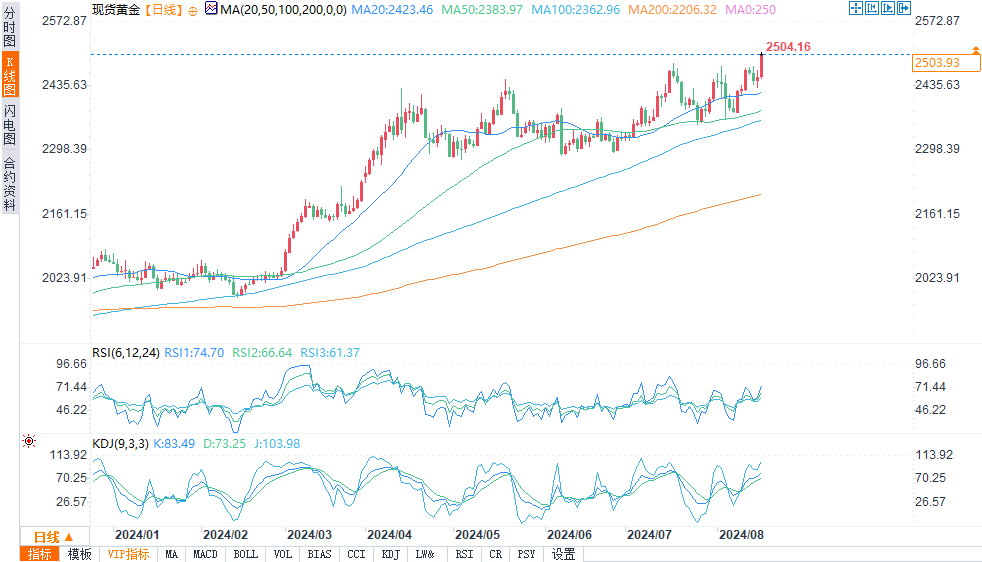 现货黄金报2504.25美元/盎司,涨幅1.95%。
