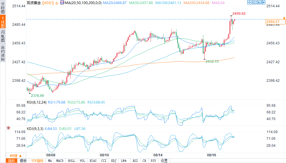 现货黄金盘中报2494.27美元/盎司,涨幅1.54%,最高触及2499.92美元/盎司。