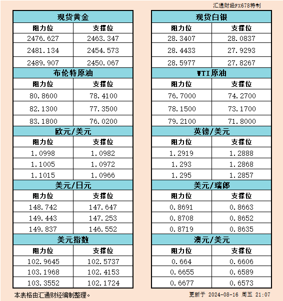 标题:8月16日美市支撑阻力:金银原油+美元指数等六大货币对