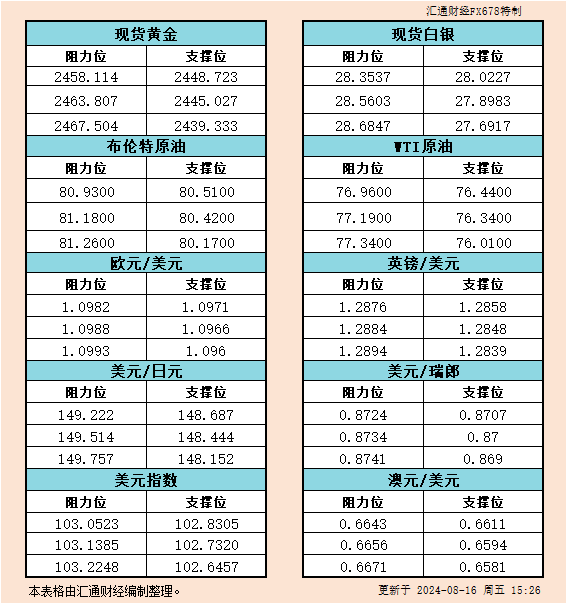 标题:8月16日欧市支撑阻力:金银原油+美元指数等六大货币对