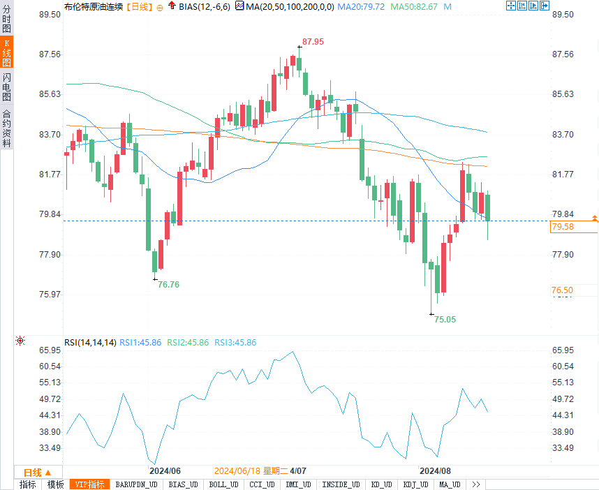 布伦特原油期货收跌1.36美元/桶,跌幅1.7%,收报79.68美元/桶。在本周的交易中,两大原油期货价格均显示出了一定的波动性,但最终未能实现显著的涨跌。