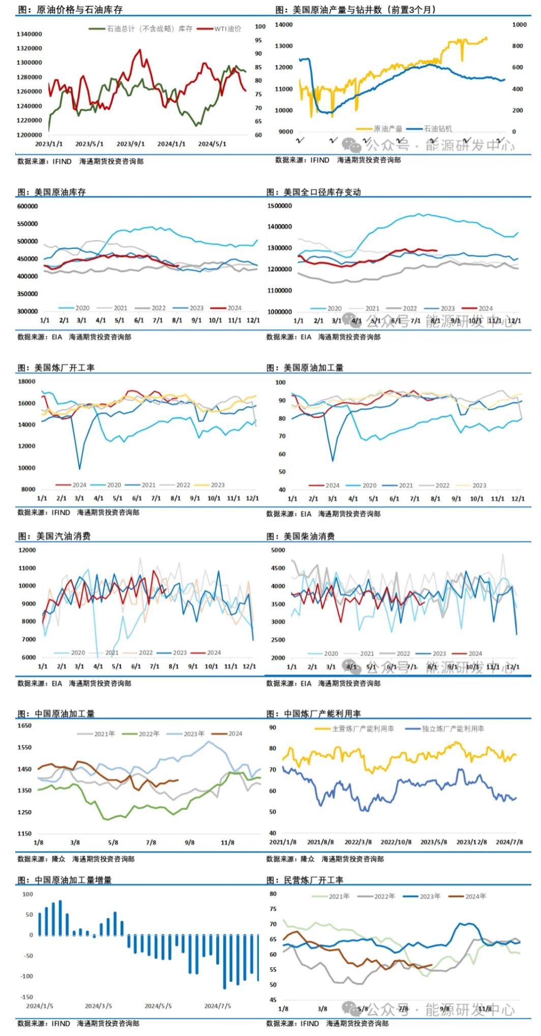 供应端IEA月报显示由于欧佩克+供应显著增加,全球石油供应在7月份上升了23万桶/日。经过四个月的增加后,6月份全球观察到的石油库存减少了2620万桶。欧佩克+的减产正在收紧实物市场,目前供应难以跟上夏季高峰需求,导致市场出现短缺。俄罗斯7月份石油出口环比下降28万桶/日,降至740万桶/日。预计2024年和2025年非欧佩克+国家的产量增长为150万桶/日。而欧佩克在其月度报告中表示,欧佩克12个成员国7月份的石油日产量为2675万桶,比6月份增加了18.5万桶,其中沙特、伊拉克和伊朗的产量增加,而利比亚的产量下降。而欧佩克+中的非欧佩克国家7月份的日产量为1416万桶,比6月份减少了6.8万桶,其中俄罗斯、哈萨克斯坦和南苏丹的日产量均有所下降。具体来看,俄罗斯的石油产量从6月份的911.5万桶/日下降至7月份的908.9万桶/日,减少2.6万桶/日。不过根据欧佩克+设定的目标,俄罗斯7月份的产量本应达到897.8万桶/日,或减少11.1万桶/日。俄罗斯能源部上周表示,7月份,“由于供应计划的一次性问题,俄罗斯7月的日产量比欧佩克+协议设定的目标高出6.7万桶,而8月和9月的水平应该可以弥补这一点。”此外,数据显示,伊拉克超过目标32.1万桶/日,哈萨克斯坦超过目标9.5万桶/日,欧佩克+超过7月石油目标8.4万桶/日。