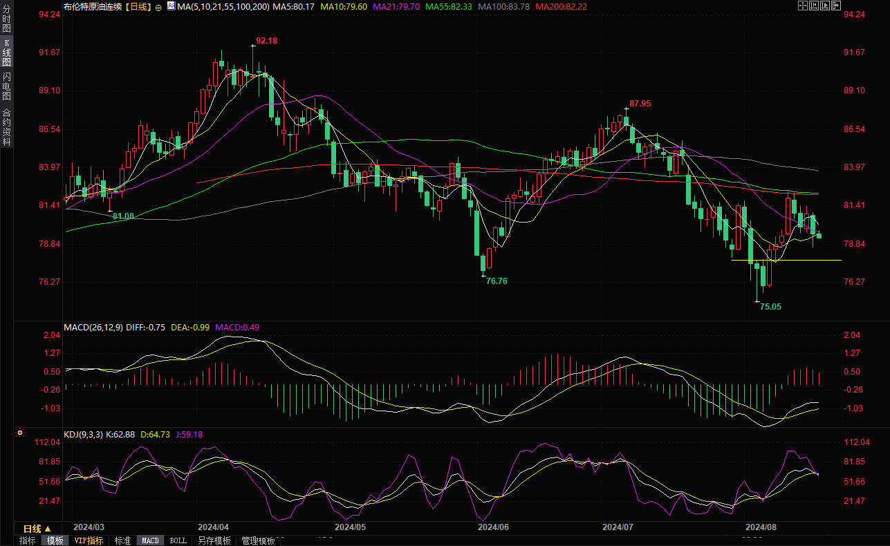 布伦特原油期货上周五下跌1.36美元,或1.7%,报收每桶79.68美元。美国原油9月期货期货上周五下跌1.51美元,或1.9%,收报每桶76.65美元。但上周周线基本收平,因为上周的一系列美国数据显示通胀趋缓,零售支出强劲。